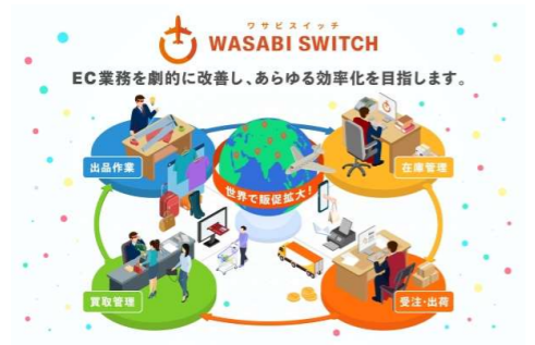 リユース品の流通業者向けに、世界への「販路拡大」と、リユース品特有の煩雑な業務を「効率化」するクラウド型の販売管理システム「WASABI SWITCH(ワサビスイッチ)」。商品を日本語で登録すれば、連携する世界34社(国内16社、海外18社)の主要ECモールに自動出品できる。また、一品ごとに品質の異なるリユース品の買取・商品登録・受注・発送・在庫管理などの全プロセスを一元管理できる。